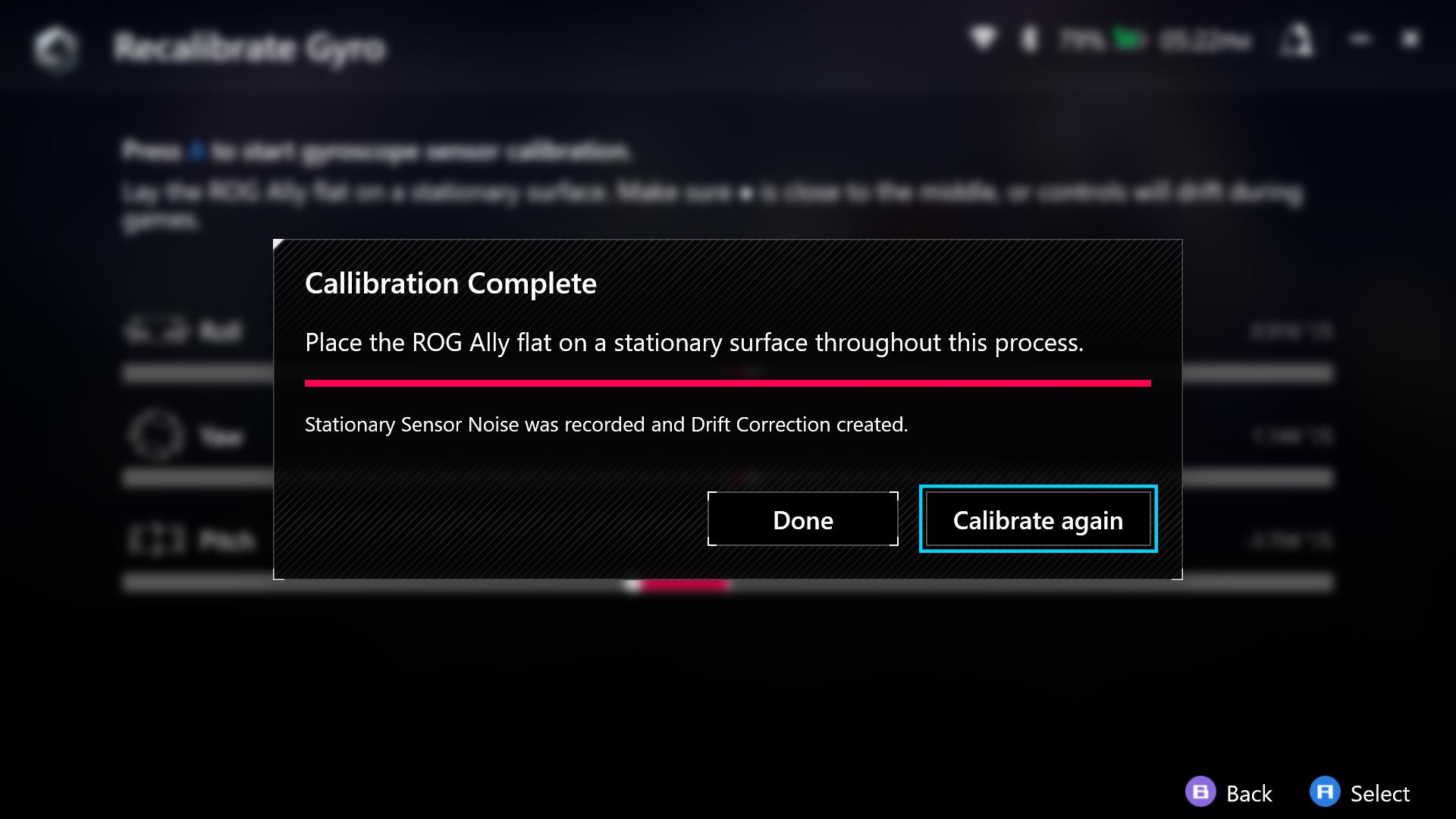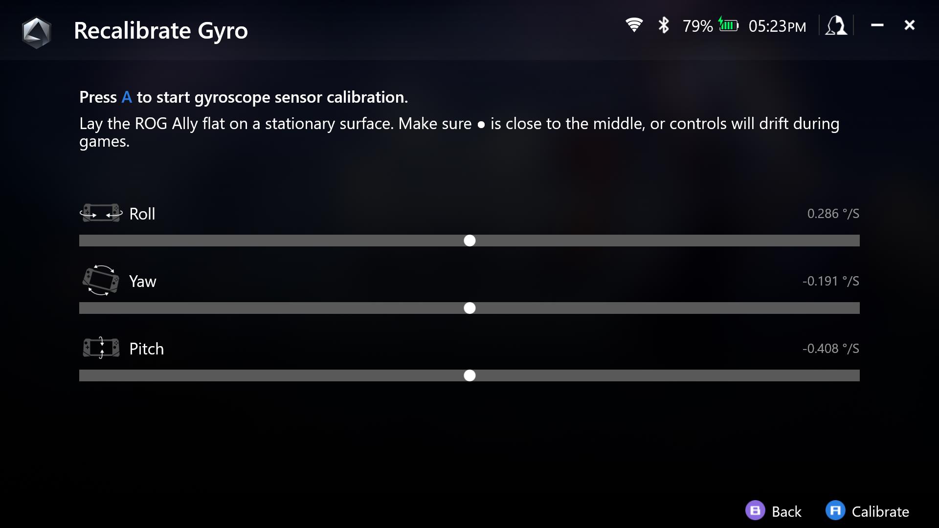 - Now you want to lay your ROG Ally flat on a stationary surface so that the dot is in the middle on all the rows. Press A to calibrate when it’s all in the middle.