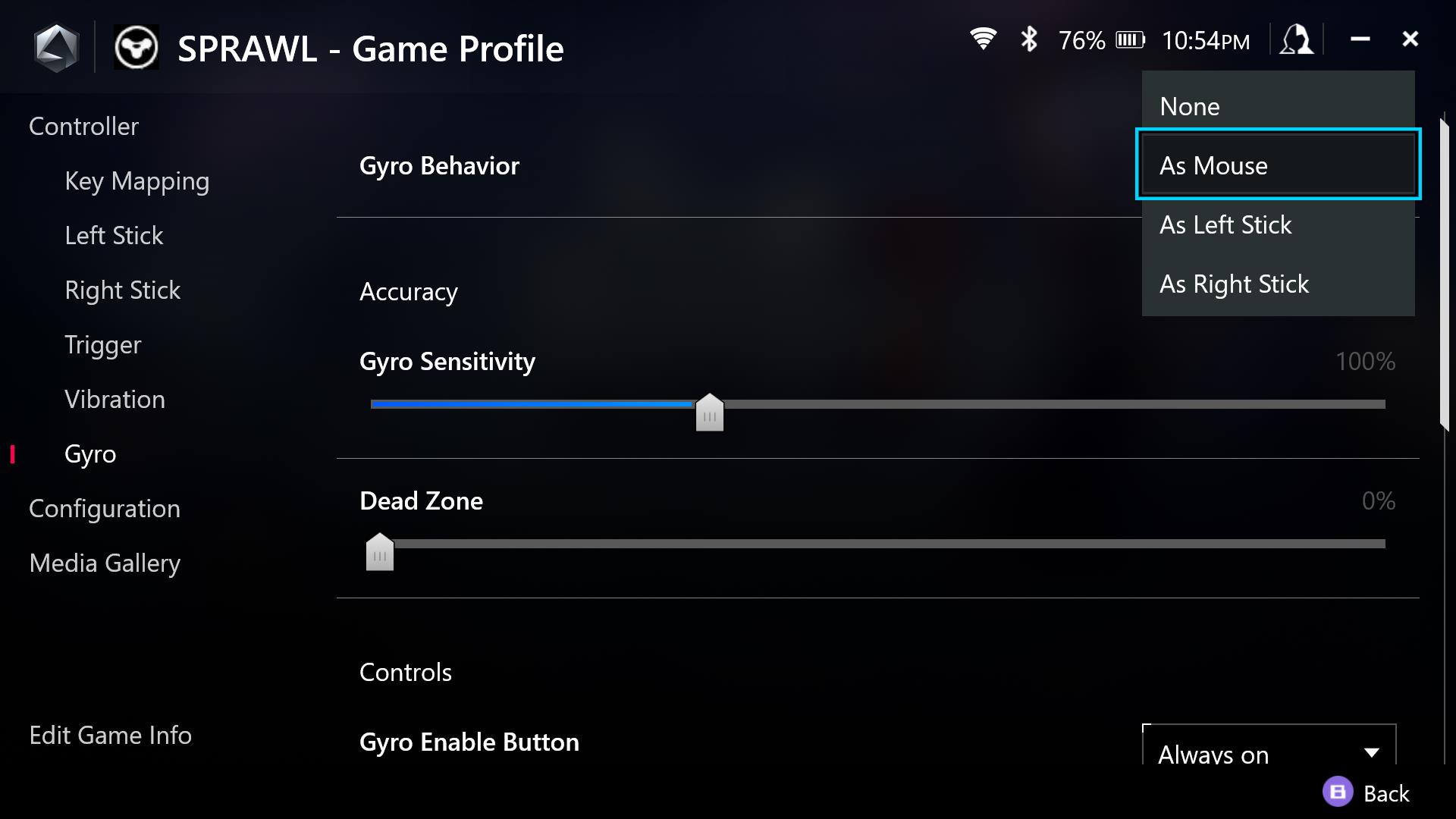- Gyro Behavior, lets you make the Gyro act as a mouse, the left joystick or the right joystick. Setting it as the Mouse or Right Stick would be ideal for shooting games and setting it to the Left Stick would be ideal for Racing games.
