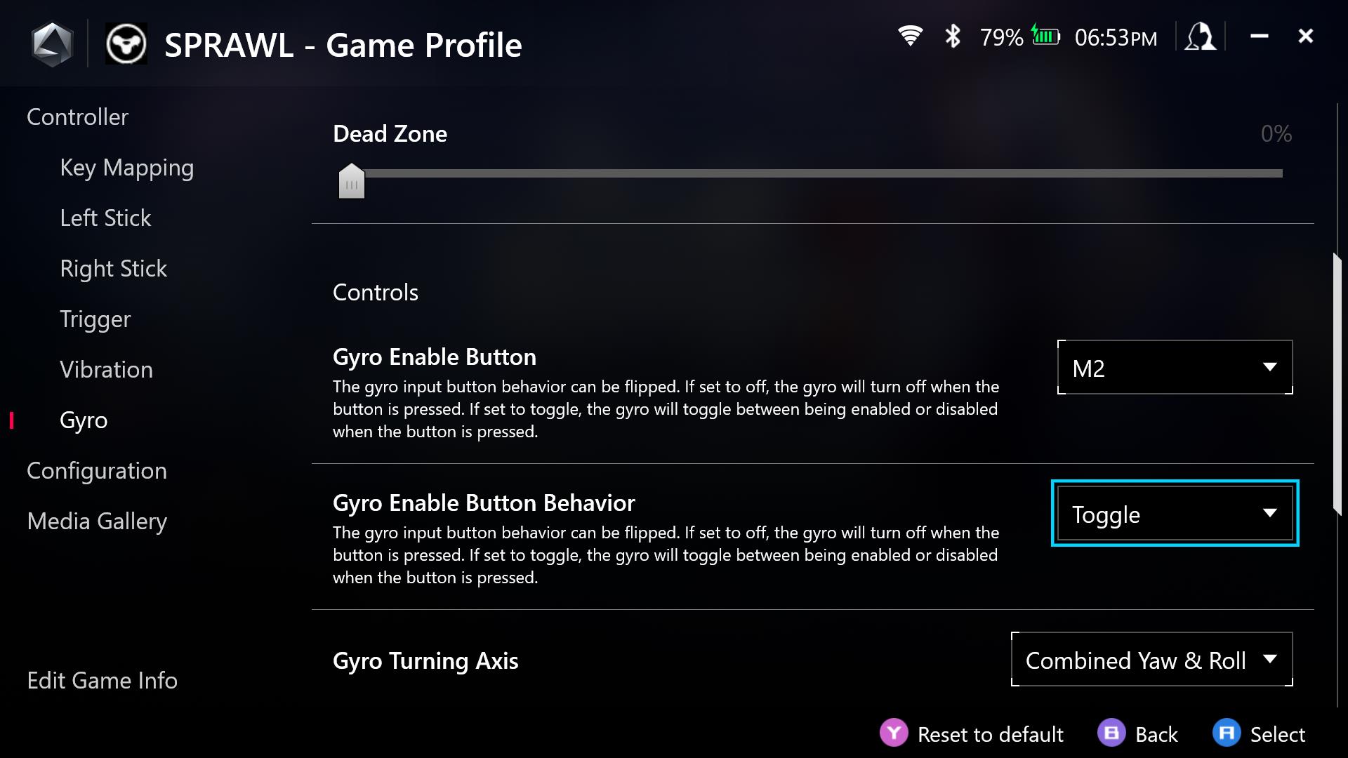 - The Gyro Enable button let’s you decide if you want it on at all times or if you want to set it to be enabled by pressing any button on the ROG Ally. The Gyro enable button behavior let’s you toggle whether you want that button to enable, disable or toggle Gyro in a game.